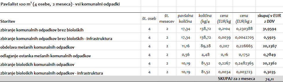 Količina storitev javnih služb za posamezno gospodinjstvo se izračuna tako, da se število oseb pomnoži z dvema mesecema in pavšalno količino na osebo na mesec. Tako izračunane količine se pomnoži s potrjenimi cenami posameznih storitev javne službe, izraženih v EUR/kg.