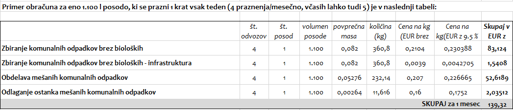 Storitev javnih služb se obračuna kot zmnožek tako ugotovljenih količin in potrjenih cen posamezne gospodarske javne službe, izraženih v EUR/kg.